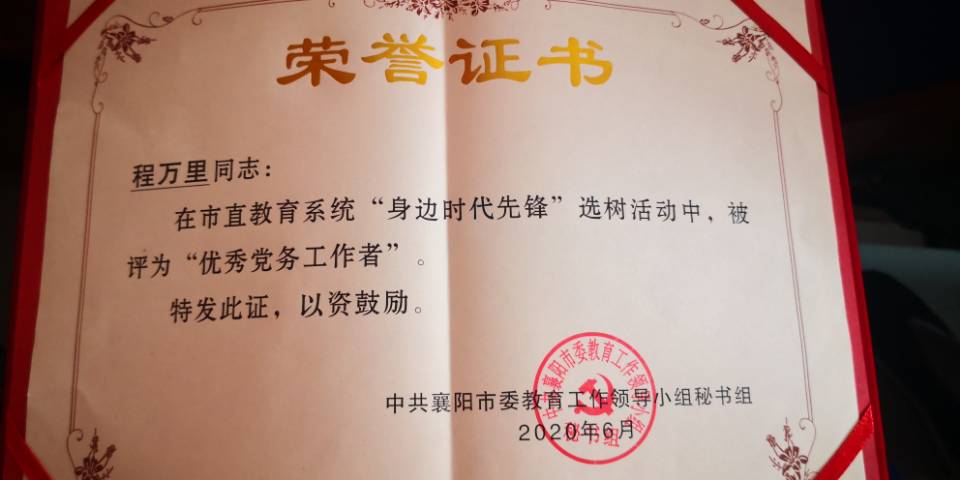 热烈祝贺我院退休职工程万里同志荣获市级"优秀党务工作者'.